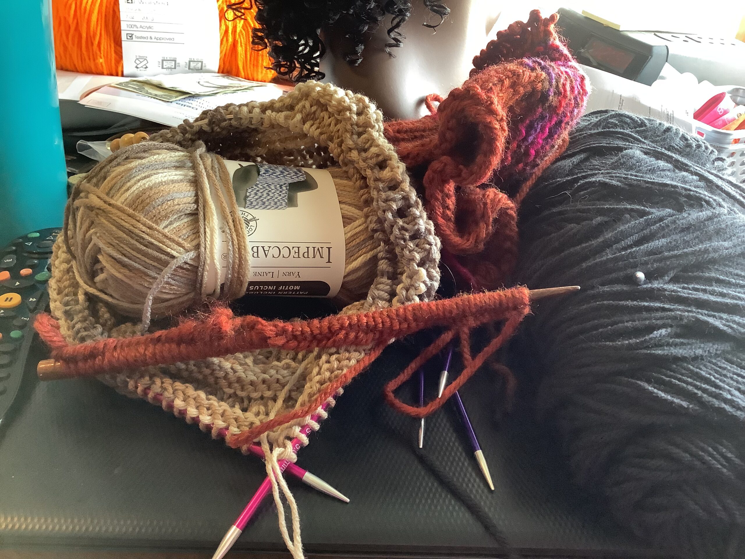 We have two hats and one prayer shawl on these needles. There are a couple of other things that didn’t make it in the pic. There is a pile of yarn in front of the yarn closet. It won’t make it in the closet because there’s no room but it may be organized as we move the sofa out of my studio and into the living room. I Maxine I will be getting some clear containers to put them all in and having stacks of yarn around me. My recliner is coming in the studio. So that will kick up the comfort level a notch.