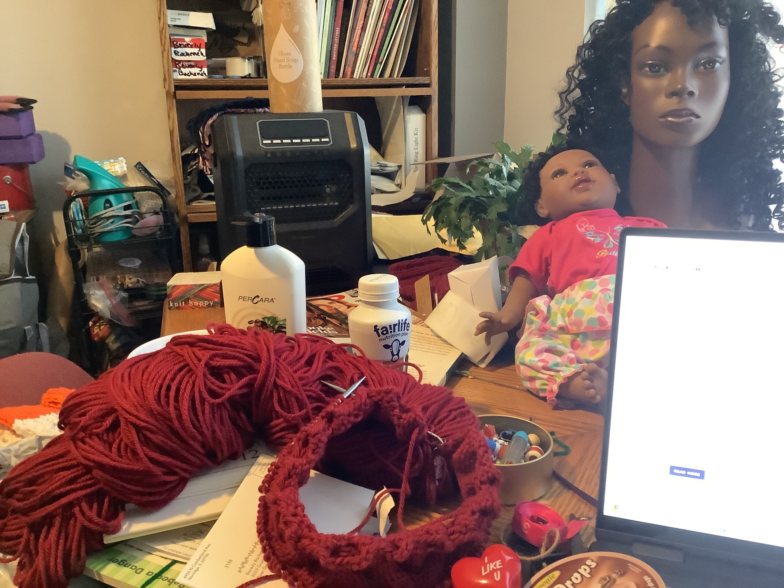 Yep. It reflects my mind. For the past few days, I’ve been waking up with the intention of doing a perfect day and it has fallen apart within the first few minutes. That cranberry red spot in upper middle is the cowl. It is the high spot within the clutter bomb.