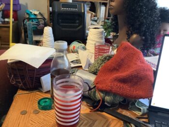 The view from the desk shows me about to make some fur pom-poms to go on top of that teal hat on the left. The space looks so huge when it’s nice and tidy. (I remember that day.)