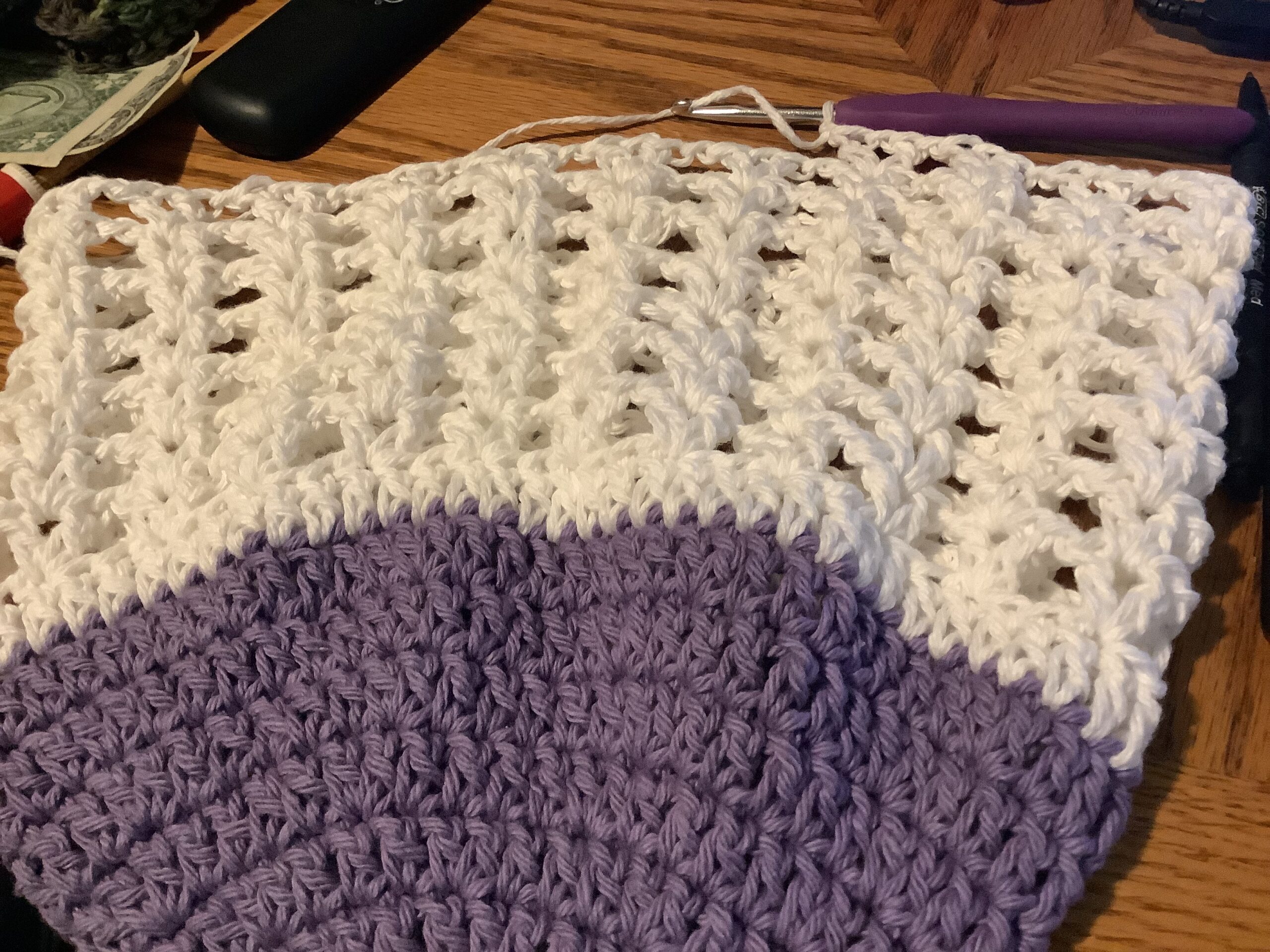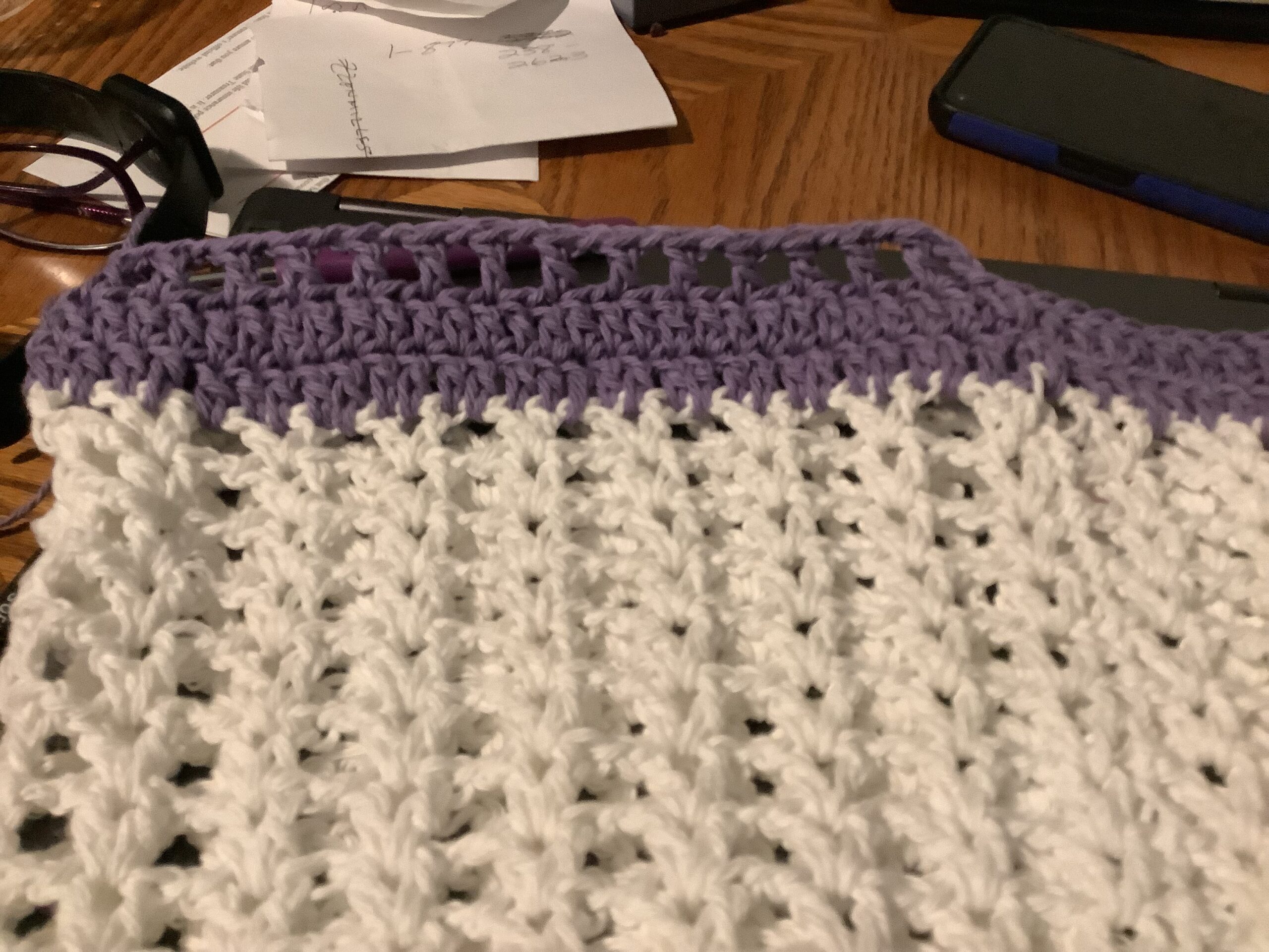 Round 11: Repeat V stitch row, placing a V stitch in the previous V stitch until the bag is two inches from the desired length. Change to color A